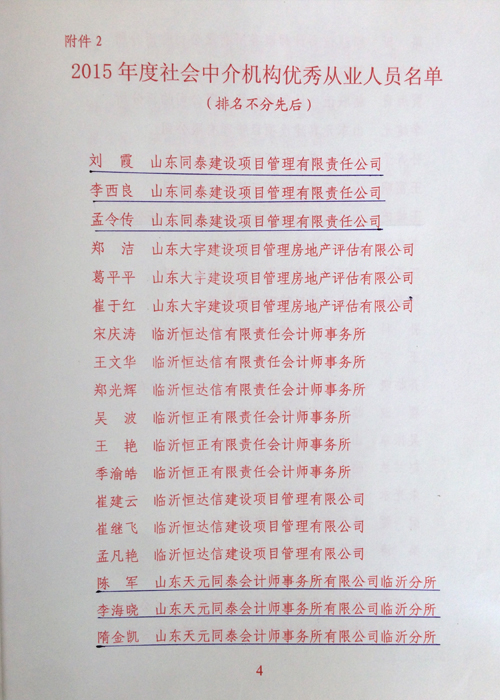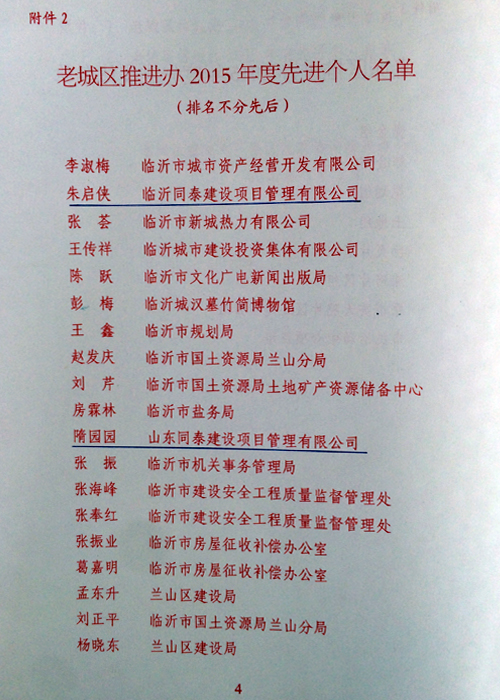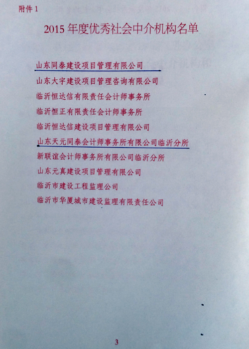 | 祝賀“同泰”獲臨沂市老城區(qū)推進辦“2015年度優(yōu)秀中介機構”! |