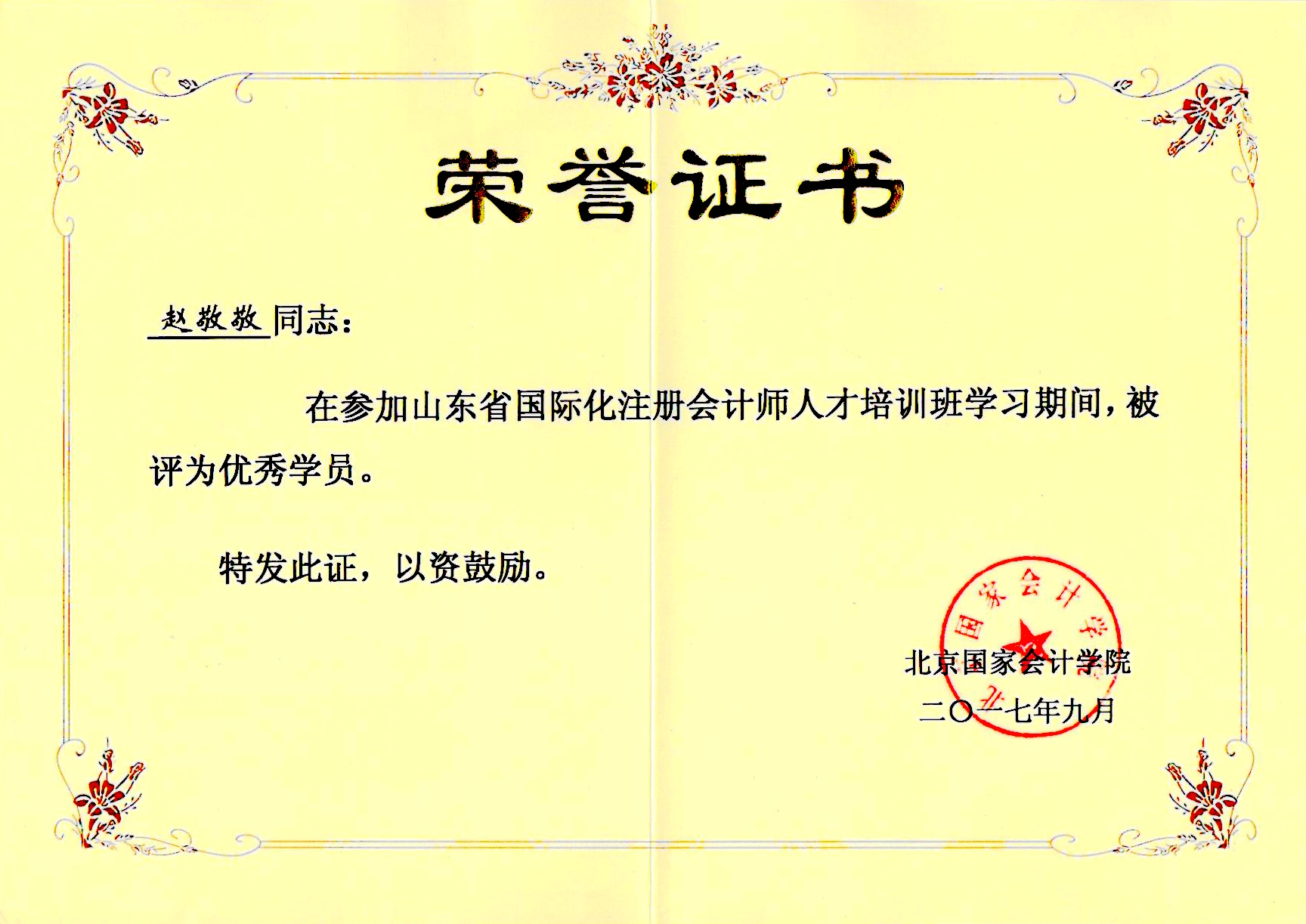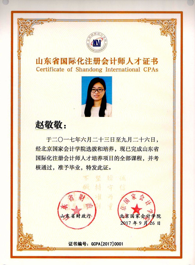 賀趙敬敬成為“山東省國際化注冊會計(jì)師人才”并獲得“優(yōu)秀學(xué)員”稱號。