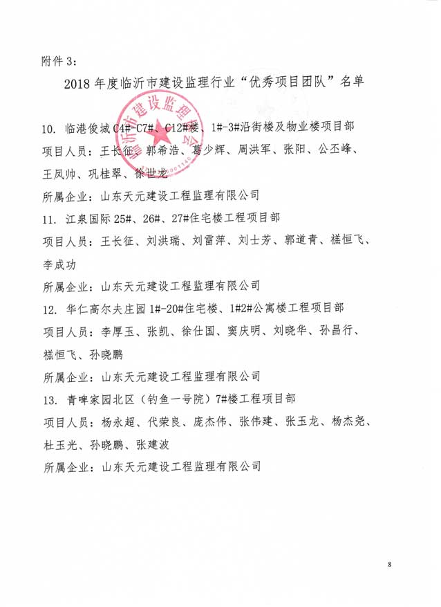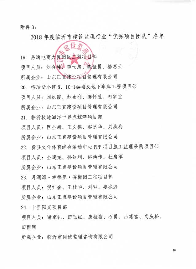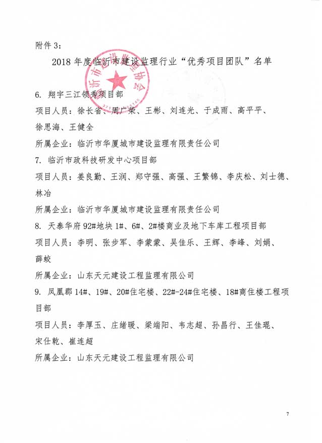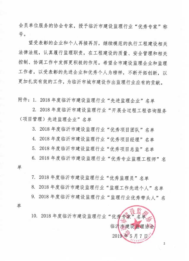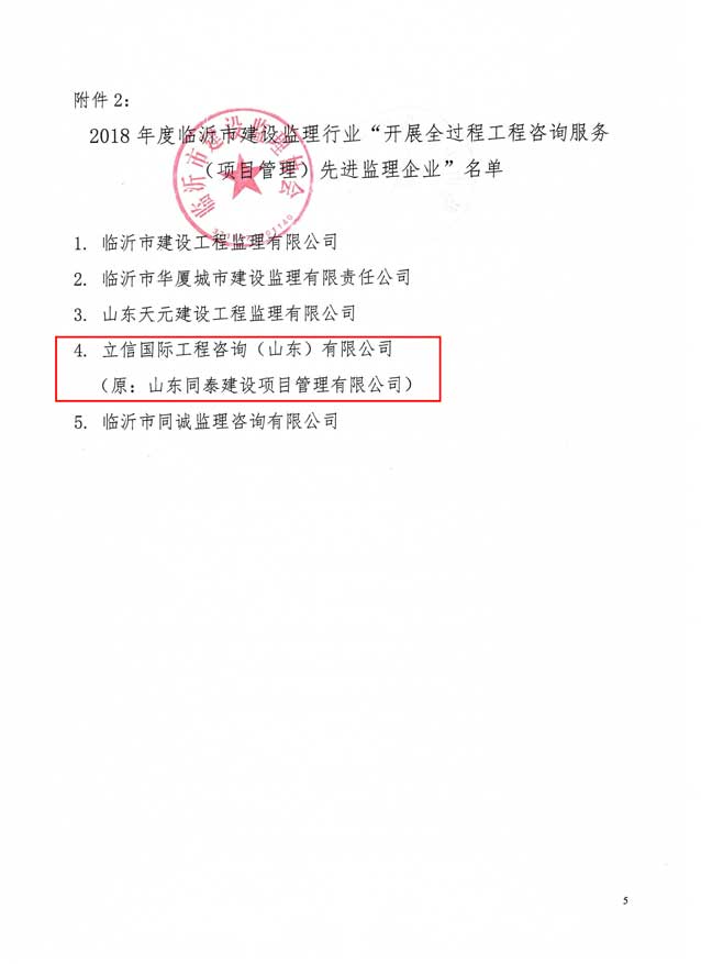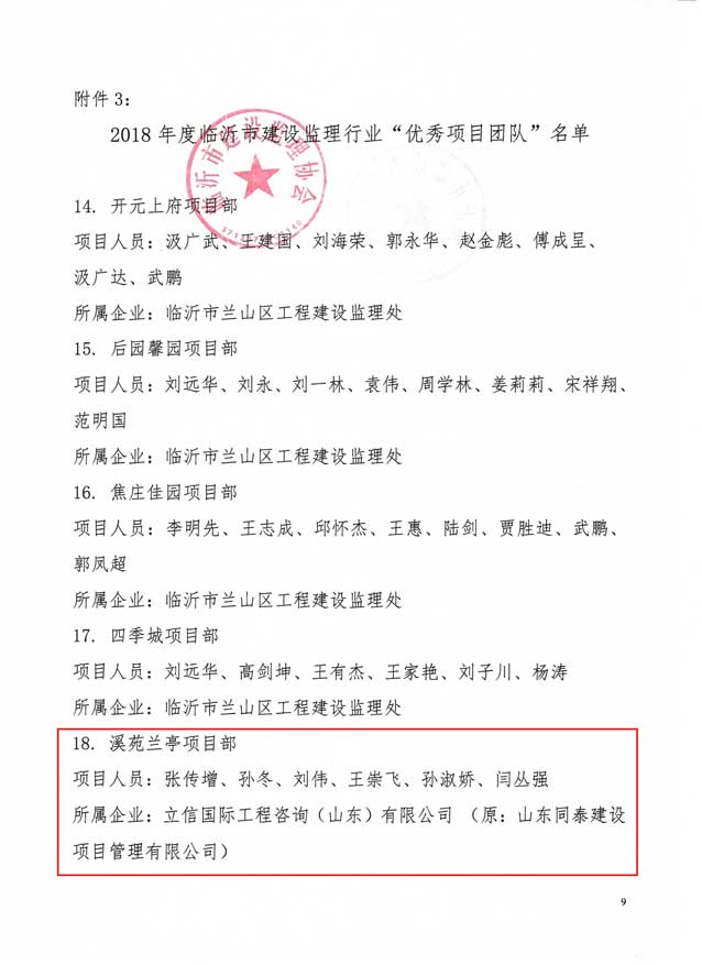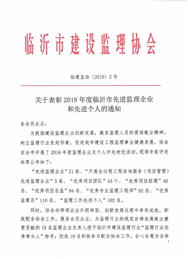 2019年5月,臨沂市建設(shè)監(jiān)理協(xié)會發(fā)文表彰2018年度臨沂先進監(jiān)理企業(yè)和先進個人。立信國際工程咨詢(山東)有限公司榮獲“先進監(jiān)理企業(yè)”、“開展全過程工程咨詢服務(wù)(項目管理)先進監(jiān)理企業(yè)”榮譽稱號、溪苑蘭亭項目部榮獲“優(yōu)秀項目團隊”榮譽稱號。