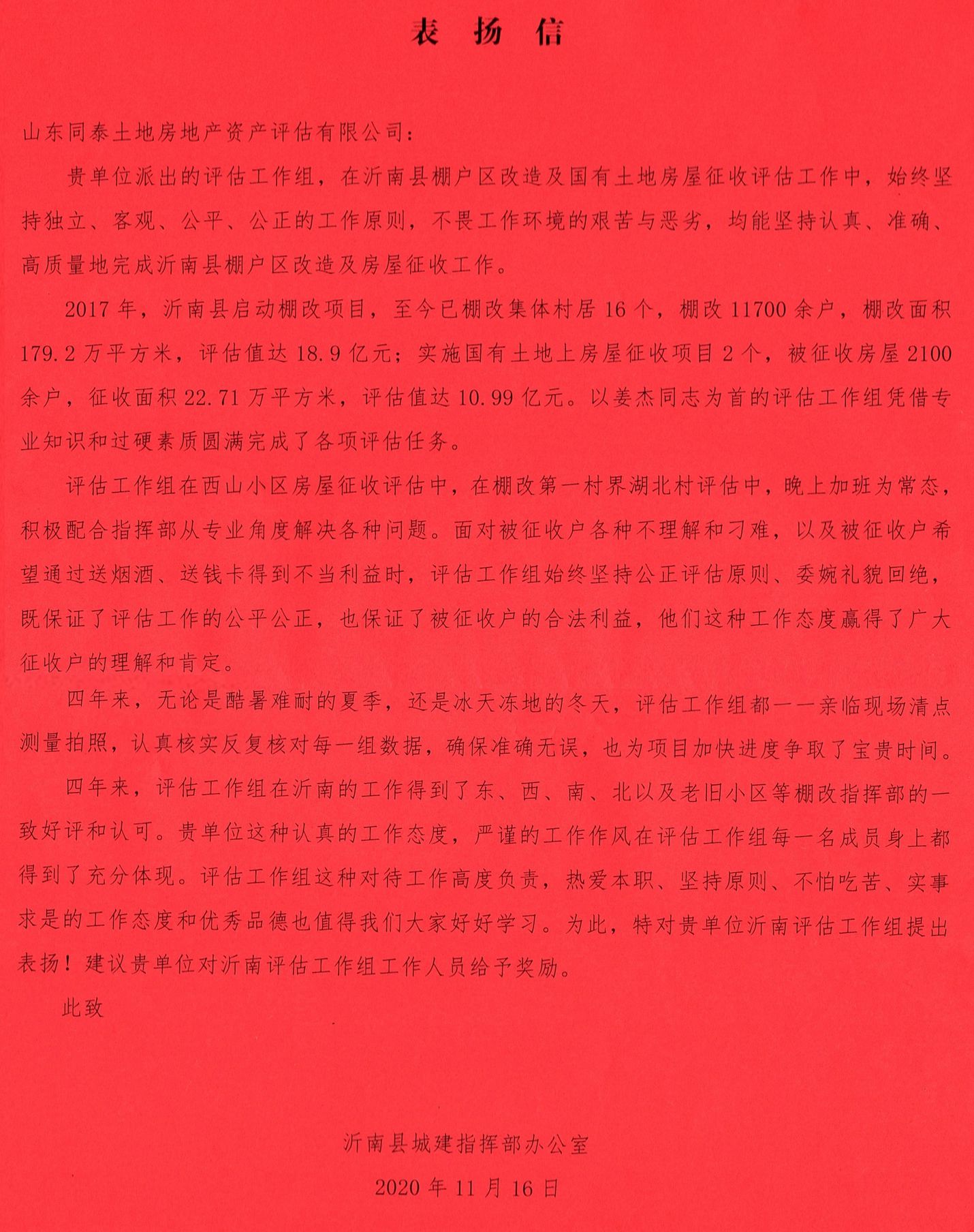 山東同泰土地房地產(chǎn)資產(chǎn)評估有限公司: 貴單位派出的評估工作組,在沂南縣棚戶區(qū)改造及國有土地房屋征收評估工作中,始終堅持獨立、客觀、公平、公正的工作原則,不畏工作環(huán)境的艱苦與惡劣,均能堅持認(rèn)真、準(zhǔn)確、高質(zhì)量地完成沂南縣棚戶區(qū)改造及房屋征收工作。2017年,沂南縣啟動棚改項目,至今已棚改集體村居16個,棚改11700余戶,棚改面積179.2萬平方米,評估值達(dá)18.9億元;實施國有土地上房屋征收項目2個,被征收房屋2100余戶,征收面積22.71萬平方米,評估值達(dá)10.99億元。以姜杰同志為首的評估工作組憑借專業(yè)知識和過硬素質(zhì)圓滿完成了各項評估任務(wù)。 評估工作組在西山小區(qū)房屋征收評估中,在棚改第一村界湖北村評估中,晚上加班為常態(tài),積極配合指揮部從專業(yè)角度解決各種問題。面對被征收戶各種不理解和刁難,以及被征收戶希望通過送煙酒、送錢卡得到不當(dāng)利益時,評估工作組始終堅持公正評估原則、委婉禮貌回絕,既保證了評估工作的公平公正,也保證了被征收戶的合法利益,他們這種工作態(tài)度贏得了廣大征收戶的理解和肯定。 四年來,無論是酷暑難耐的夏季,還是冰天凍地的冬天,評估工作組都一一親臨現(xiàn)場清點測量拍照,認(rèn)真核實反復(fù)核對每一組數(shù)據(jù),確保準(zhǔn)確無誤,也為項目加快進(jìn)度爭取了寶貴時間。 四年來,評估工作組在沂南的工作得到了東、西、南、北以及老舊小區(qū)等棚改指揮部的一致好評和認(rèn)可。貴單位這種認(rèn)真的工作態(tài)度,嚴(yán)謹(jǐn)?shù)墓ぷ髯黠L(fēng)在評估工作組每一名成員身上都得到了充分體現(xiàn)。評估工作組這種對待工作高度負(fù)責(zé),熱愛本職、堅持原則、不怕吃苦、實事求是的工作態(tài)度和優(yōu)秀品德也值得我們大家好好學(xué)習(xí)。為此,特對貴單位沂南評估工作組提出表揚!建議貴單位對沂南評估工作組工作人員給予獎勵。 此致 沂南縣城建指揮部辦公室 2020年11月16日