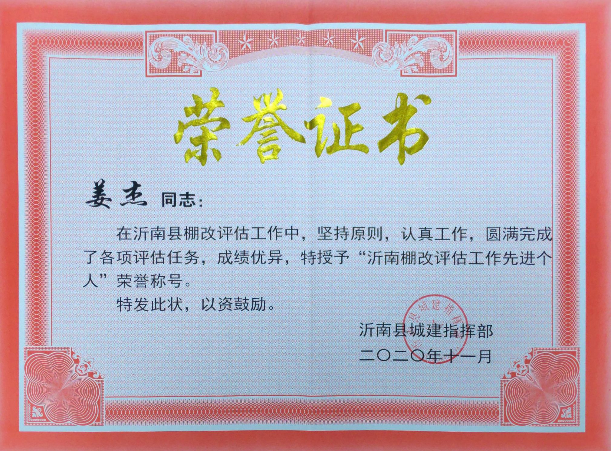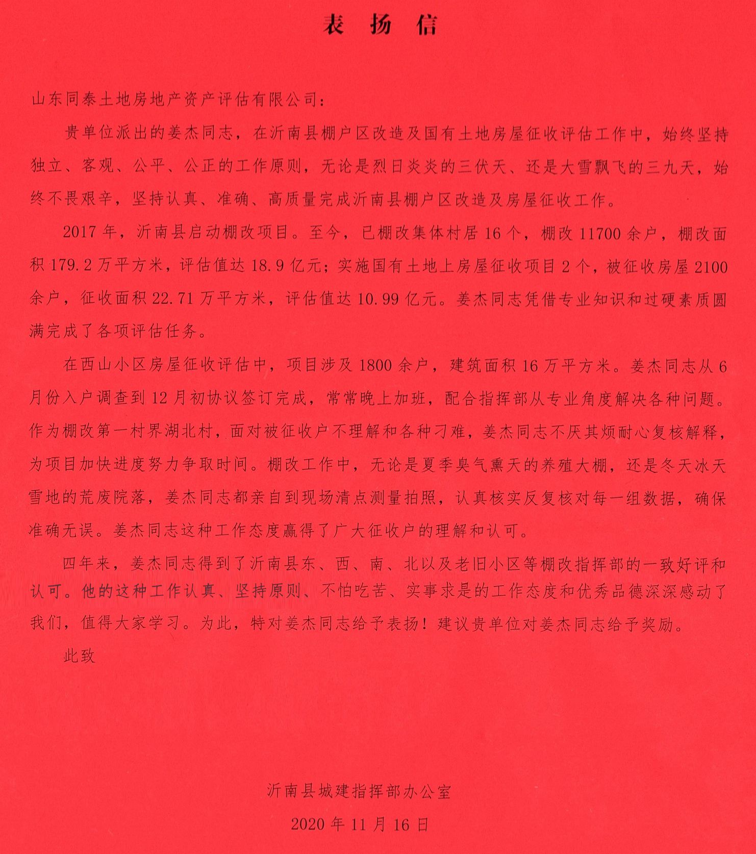 表揚信 山東同泰土地房地產(chǎn)資產(chǎn)評估有限公司: 貴單位派出的姜杰同志,在沂南縣棚戶區(qū)改造及國有土地房屋征收評估工作中,始終堅持獨立、客觀、公平、公正的工作原則,無論是烈日炎炎的三伏天、還是大雪飄飛的三九天,始終不畏艱辛,堅持認(rèn)真、準(zhǔn)確、高質(zhì)量完成沂南縣棚戶區(qū)改造及房屋征收工作。 2017年,沂南縣啟動棚改項目。至今,已棚改集體村居16個,棚改11700余戶,棚改面積179.2萬平方米,評估值達(dá)18.9億元;實施國有土地上房屋征收項目2個,被征收房屋2100余戶,征收面積22.71萬平方米,評估值達(dá)10.99億元。姜杰同志憑借專業(yè)知識和過硬素質(zhì)圓滿完成了各項評估任務(wù)。 在西山小區(qū)房屋征收評估中,項目涉及1800余戶,建筑面積16萬平方米。姜杰同志從6月份入戶調(diào)查到12月初協(xié)議簽訂完成,常常晚上加班,配合指揮部從專業(yè)角度解決各種問題。作為棚改第一村界湖北村,面對被征收戶不理解和各種刁難,姜杰同志不厭其煩耐心復(fù)核解釋,為項目加快進(jìn)度努力爭取時間。棚改工作中,無論是夏季臭氣熏天的養(yǎng)殖大棚,還是冬天冰天雪地的荒廢院落,姜杰同志都親自到現(xiàn)場清點測量拍照,認(rèn)真核實反復(fù)核對每一組數(shù)據(jù),確保準(zhǔn)確無誤。姜杰同志這種工作態(tài)度贏得了廣大征收戶的理解和認(rèn)可。 四年來,姜杰同志得到了沂南縣東、西、南、北以及老舊小區(qū)等棚改指揮部的一致好評和認(rèn)可。他的這種工作認(rèn)真、堅持原則、不怕吃苦、實事求是的工作態(tài)度和優(yōu)秀品德深深感動了我們,值得大家學(xué)習(xí)。為此,特對姜杰同志給予表揚!建議貴單位對姜杰同志給予獎勵。 此致沂南縣城建指揮部辦公室 2020年11月16日