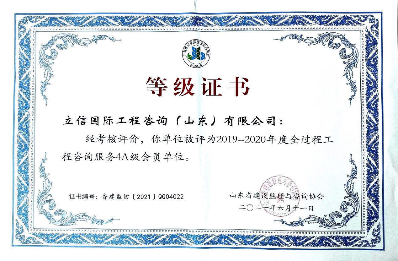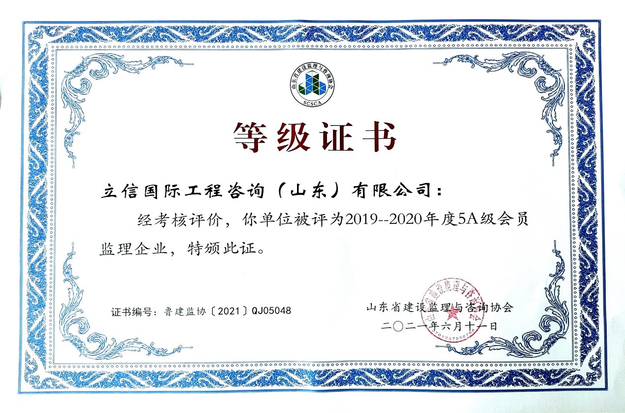 2021年6月,山東省建設(shè)監(jiān)理與咨詢協(xié)會(huì)、臨沂市建設(shè)監(jiān)理協(xié)會(huì)分別開展了有關(guān)全過(guò)程咨詢服務(wù)、監(jiān)理等業(yè)務(wù)的各項(xiàng)綜合考評(píng),立信國(guó)際工程咨詢(山東)有限公司在考評(píng)中獲得較高信用等級(jí)。 在山東省建設(shè)監(jiān)理與咨詢協(xié)會(huì)開展的2019-2020年度全過(guò)程咨詢服務(wù)業(yè)務(wù)會(huì)員單位考核評(píng)價(jià)工作中,我公司被評(píng)選為山東省首批5A級(jí)會(huì)員監(jiān)理企業(yè)、5A級(jí)會(huì)員招標(biāo)代理機(jī)構(gòu)、4A級(jí)全過(guò)程工程咨詢服務(wù)會(huì)員單位。 我公司員工多人被山東省建設(shè)監(jiān)理與咨詢協(xié)會(huì)評(píng)選為2019-2020年度先進(jìn),其中,馬海嘯、張傳增被評(píng)為5A級(jí)總監(jiān)理工程師,高宏、張傳增被評(píng)為5A級(jí)招標(biāo)代理項(xiàng)目負(fù)責(zé)人,呂建建、彭紅運(yùn)被評(píng)為4A級(jí)招標(biāo)代理項(xiàng)目負(fù)責(zé)人。