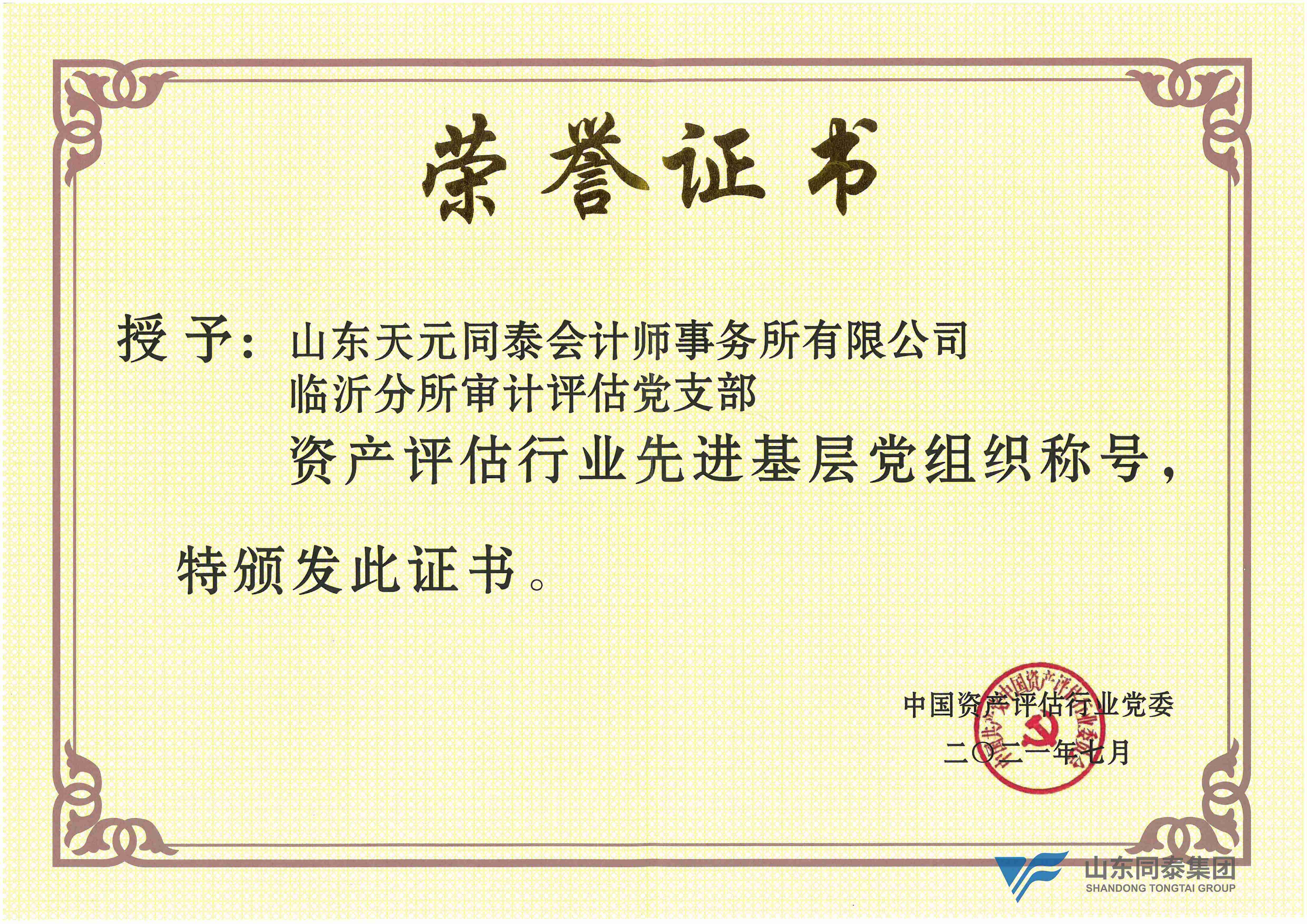 為慶祝中國共產(chǎn)黨建黨100周年,進一步貫徹落實習(xí)近平新時代中國特色社會主義思想,7月22日下午,全國注冊會計師資產(chǎn)評估行業(yè)“兩先一優(yōu)”表彰暨黨史學(xué)習(xí)教育推進會在北京國家會計學(xué)院隆重召開。財政部黨組成員、副部長朱忠明出席會議并講話。山東天元同泰會計師事務(wù)所有限公司臨沂分所審計評估黨支部被中國資產(chǎn)評估行業(yè)黨委授予“資產(chǎn)評估行業(yè)先進基層黨組織”稱號。