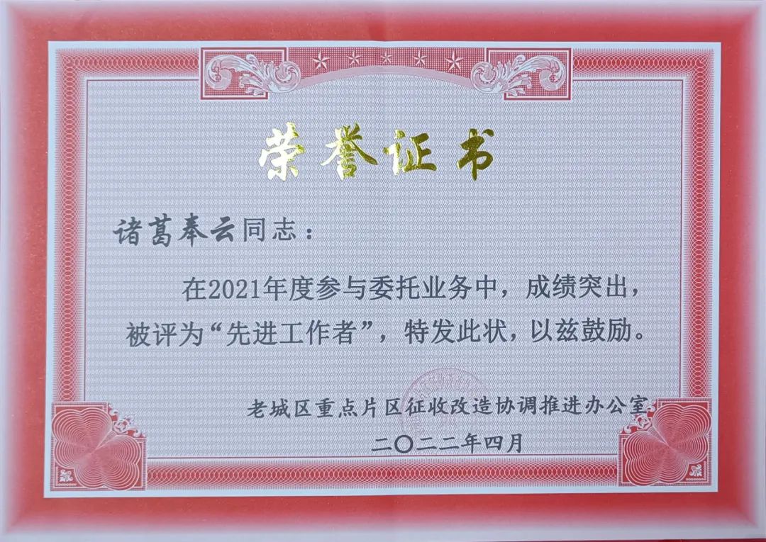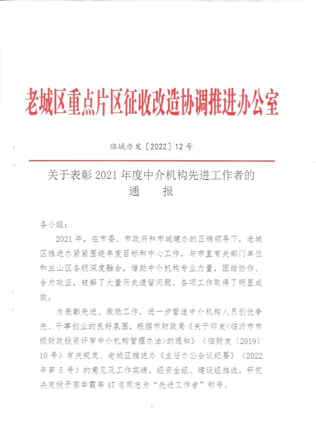 近日,臨沂市老城區(qū)重點片區(qū)征收改造協(xié)調(diào)推進辦公室對2021年度中介機構先進工作者進行了表彰,我集團張森、隋金凱、劉霞、王甲玲、段德志、王友麗、諸葛奉云、孫運艷共8名同志被授予“先進工作者”榮譽稱號。 臨沂市老城區(qū)重點片區(qū)征收改造協(xié)調(diào)推進辦公室負擔著我市老城區(qū)的征收改造和開發(fā)建設工作,我集團作為改造建設工作的中介機構秉承著獨立、客觀、公正的執(zhí)業(yè)準則,積極開展財務審計、拆遷評估、預算編制、工程咨詢、造價咨詢等各項業(yè)務。多年來,我集團各執(zhí)業(yè)機構的工作人員始終堅持以精益求精的專業(yè)精神、積極飽滿的工作熱情和嚴謹扎實的執(zhí)業(yè)作風來開展各項工作,“同泰”集團和“同泰”人先后多次獲得臨沂市政府、市住建局等政府部門和社會各界的表彰好評,為努力推動臨沂市經(jīng)濟社會發(fā)展貢獻自己的專業(yè)力量。